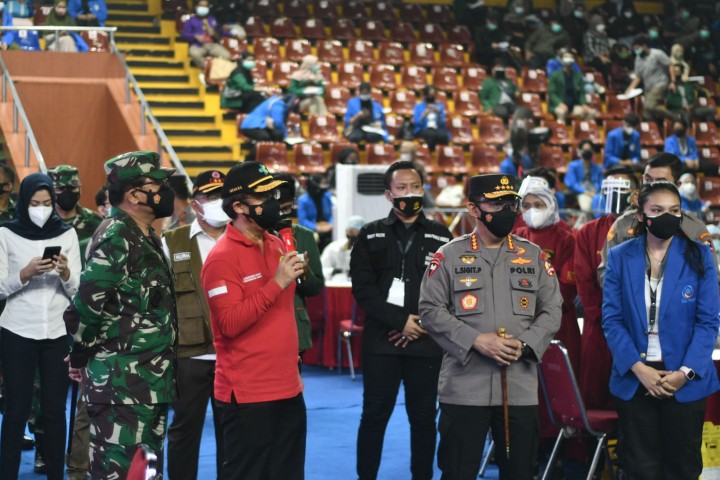 Kapolri bersama Panglima TNI Marsekal Hadi Tjahjanto dan Menteri Kesehatan Budi Gunadi Sadikin mengapresiasi peran serta mahasiswa melalui organisasi dan aliansi mahasiswa dari sejumlah perguruan tinggi di Jabodetabek melaksanakan vaksinasi massal dengan menerapkan protokol kesehatan yang ketat.