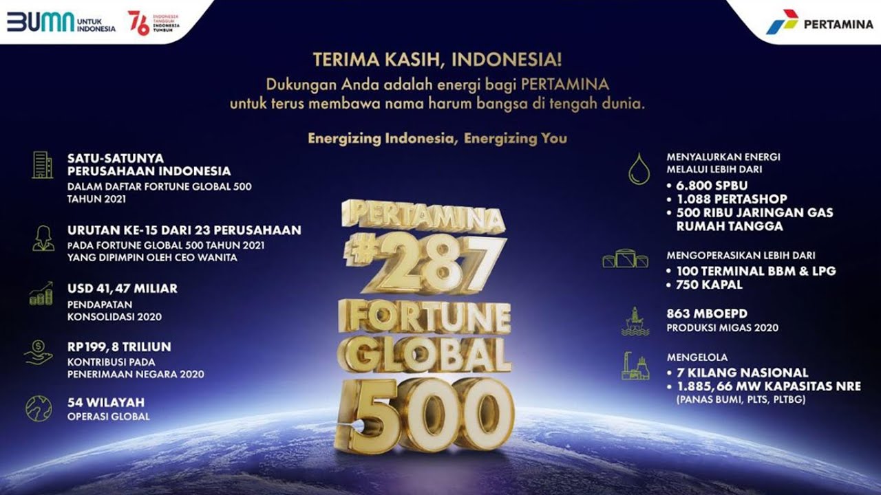Sebagaimana diketahui, Pertamina menjadi satu-satunya perusahaan Indonesia yang masuk dalam daftar Fortune Global 500. Dengan nilai revenue perusahaan sebesar US$ 41,47 Miliar pada tahun buku 2020, Pertamina berada di posisi 287.