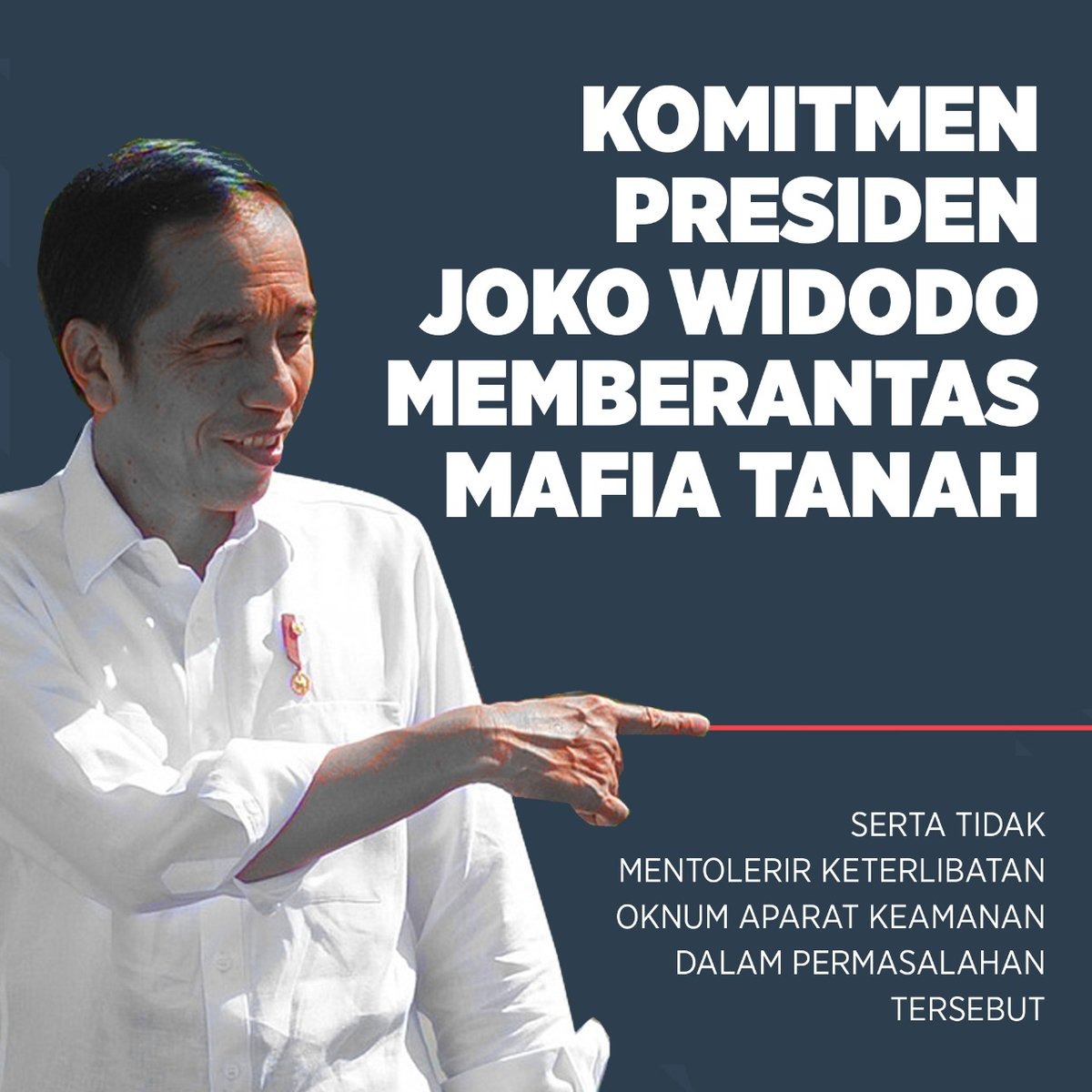 Jakarta — Presiden Joko Widodo atau Jokowi menginstruksikan pemberantasan para pelaku mafia tanah di Indonesia, termasuk terhadap aparat keamanan yang membekingi. Polri pun memastikan penegakan hukum tidak akan pandang bulu.