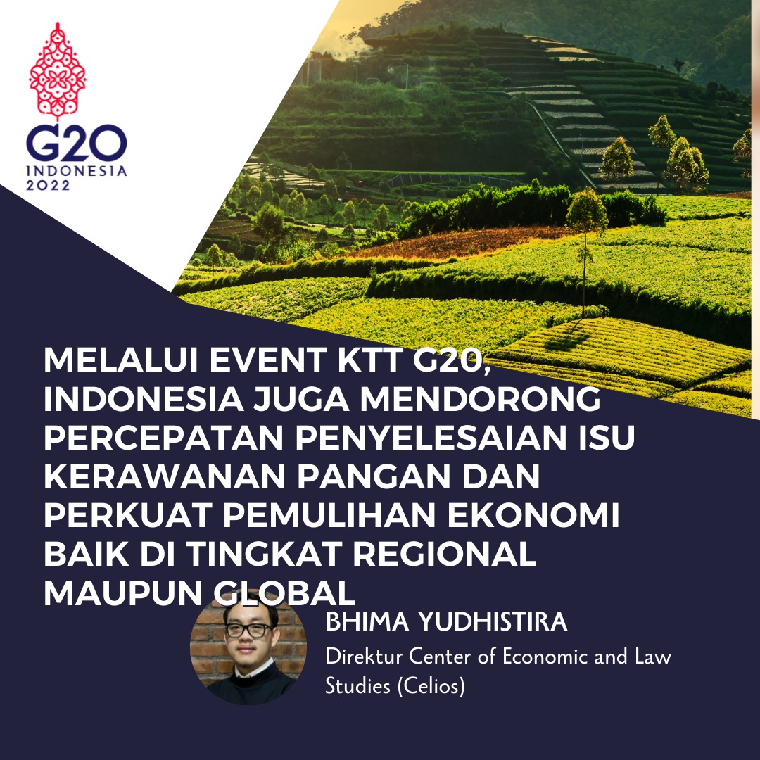JAKARTA – Direktur Center of Economics and Law Studies (Celios) Bhima Yudhistira menyatakan, Presidensi G20 Indonesia sangat krusial dalam menyelamatkan ketahanan pangan global. Pasalnya, saat ini terjadi perang Rusia dan Ukraina.